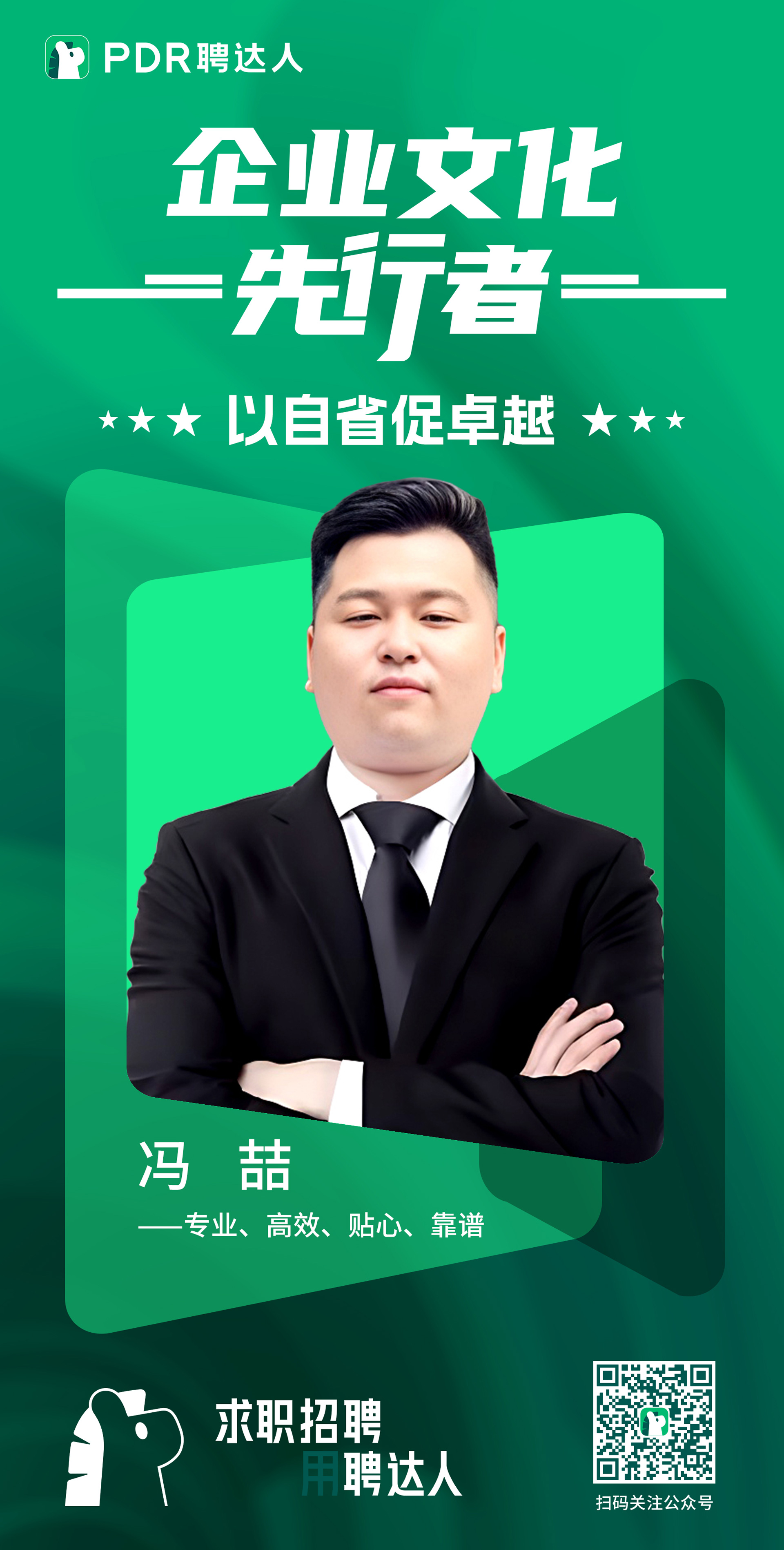 馮喆超強的自省力和自驅力深刻貫徹執行了聘達人「以自省促卓越」集團核心價值觀。