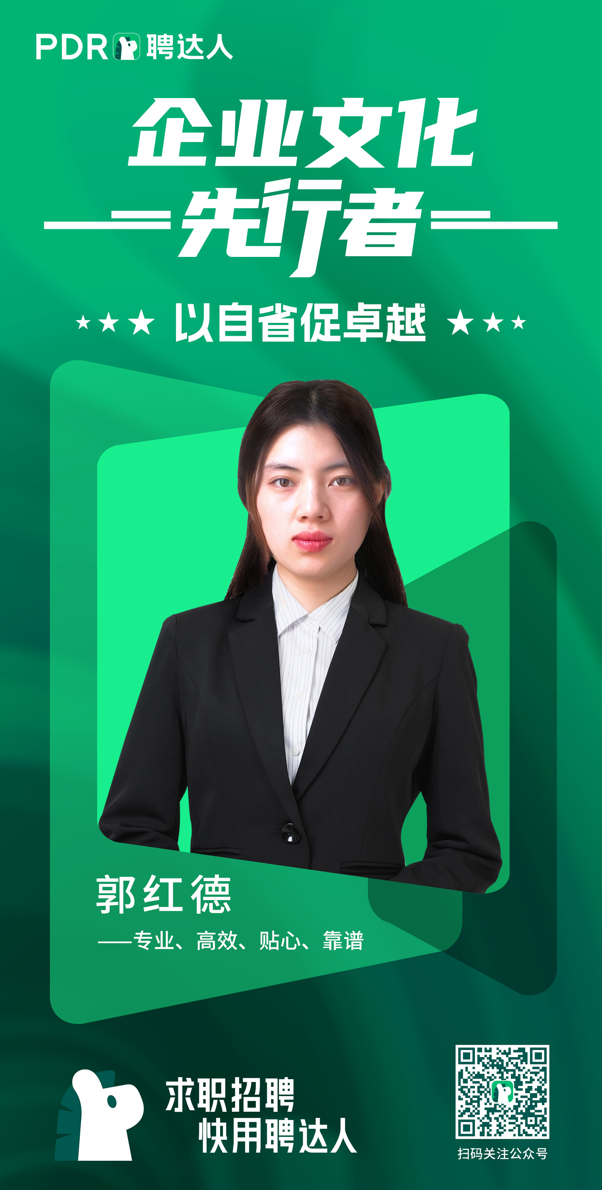 本期,我們?cè)u(píng)選出的聘達(dá)人「以自省促卓越」企業(yè)文化先行者是事業(yè)十四部求職顧問郭紅德,作為在聘達(dá)人集團(tuán)就職的優(yōu)秀人才,郭紅德不斷奮斗,精進(jìn)自己,做出了優(yōu)秀的成果。