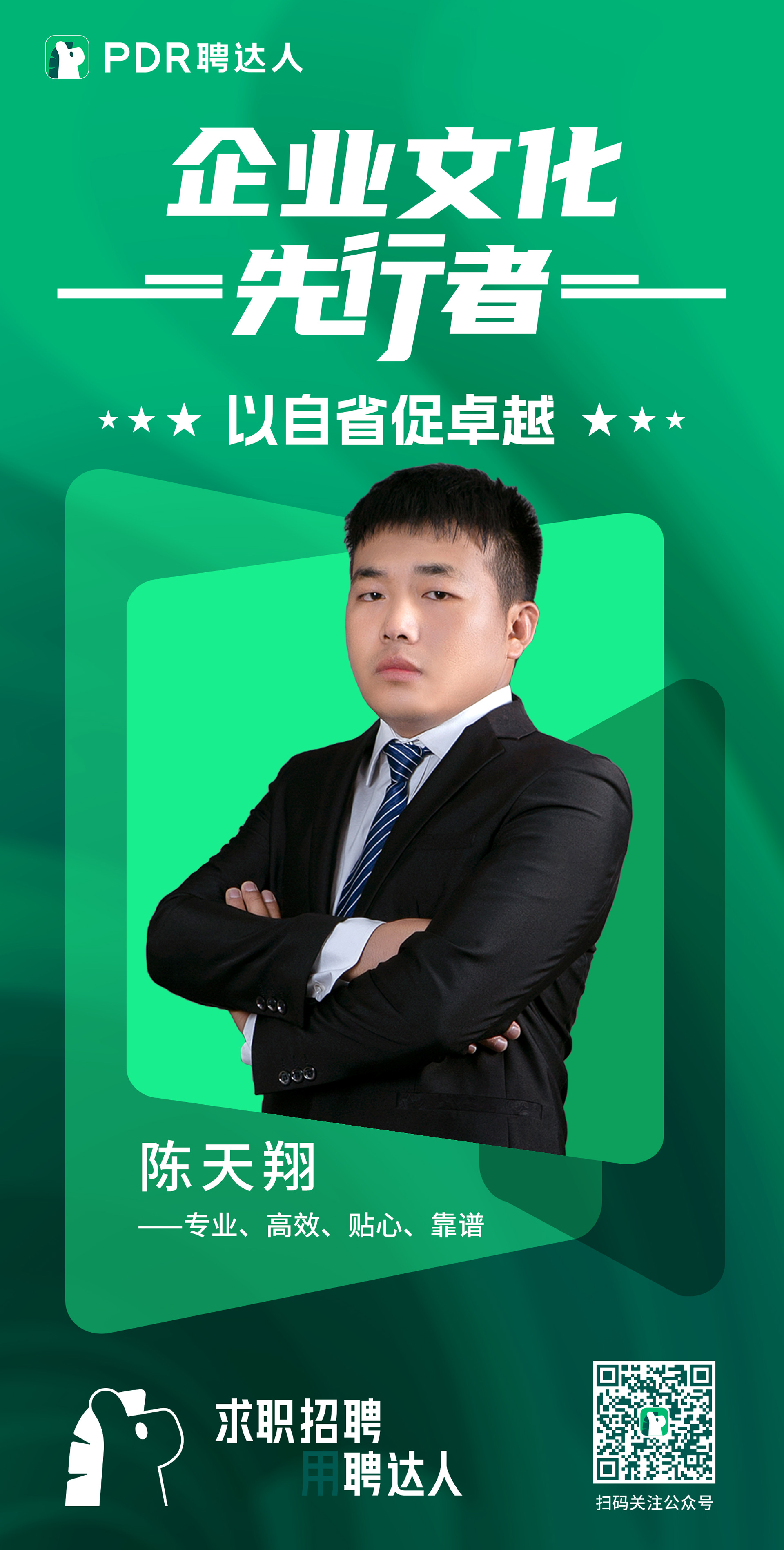 本期,我們評選出的聘達人「以自省促卓越」企業文化先行者是事業十部儲備事業部總監陳天翔,作為在聘達人集團就職4年的優秀人才,不斷奮斗,做出了優秀的成果。